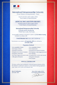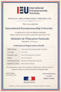 The International Entrepreneurship University (IEU) is a legally registered private higher education institution in France, authorised to operate as a distance learning institution (établissement d’enseignement privé à distance) under the regulatory provisions of Articles L.444-1 to R.444-28 of the French Code de l’Éducation.